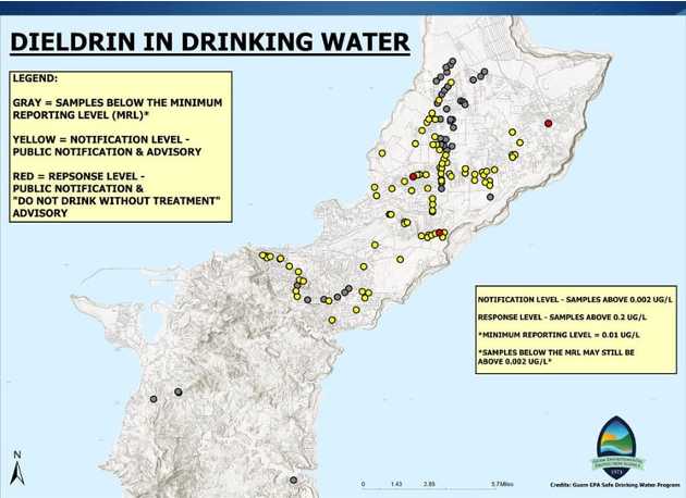 Other than chloride (saltwater) that can limit or even terminate/halt utility water production, Per- and polyflouroalkyl substances (PFAS) and Dieldrin are now in the headlines for contaminants of concern (PDNGDP). PFAS is manufactured mainly for its special properties that the chemical is both hydrophobic and oleophobic – repels water and oil. PFAS is a health concern as the chemicals are found to accumulate in the body. In a WERI study, a form of PFAS was found present in every site tested (Duenas et al. 2023). USEPA data for Guam maps the PFAS in production wells. Dieldrin on the other hand is a banned pesticide (1987) and is classified as a probable human carcinogen, according to USEPA. Guam EPA provides a map of production wells with levels of Dieldrin for notification and response (next two pages).