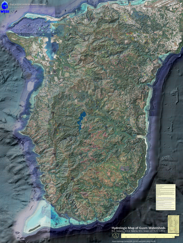 Hydrologic Map of Guam Watersheds (2025), a large format (6’ x 8’) high resolution map. This map is currently in pdf format and is now available for viewing and download at the GHS website.