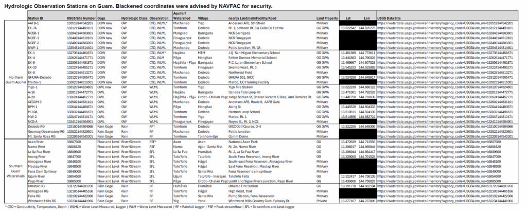 Hydrologic Observation Stations on Guam. Blackened coordinates were advised by NAVFAC for security.