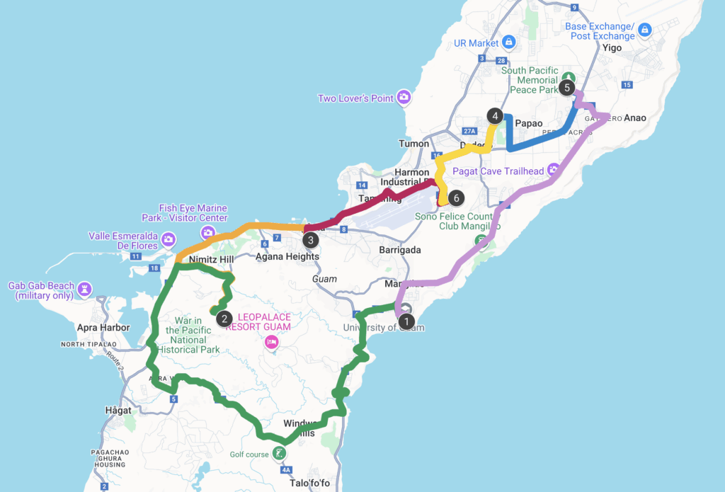 - No restrooms will be available except at Stops 3 (Agana Shopping Center) and 5 (Mataguac Hill).